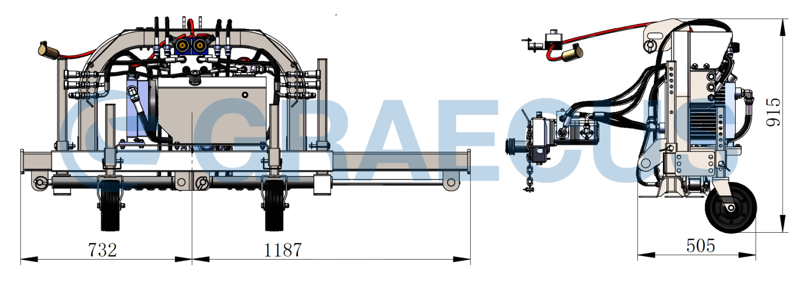 Brațele pliabile hidraulic permit reglarea rapidă a poziției de lucru, iar suportul reglabil pe roți asigură stabilitate și control al înălțimii în timpul utilizării. Prinderea se face în trei puncte, categoria II, fiind compatibilă cu majoritatea tractoarelor din gama medie.
