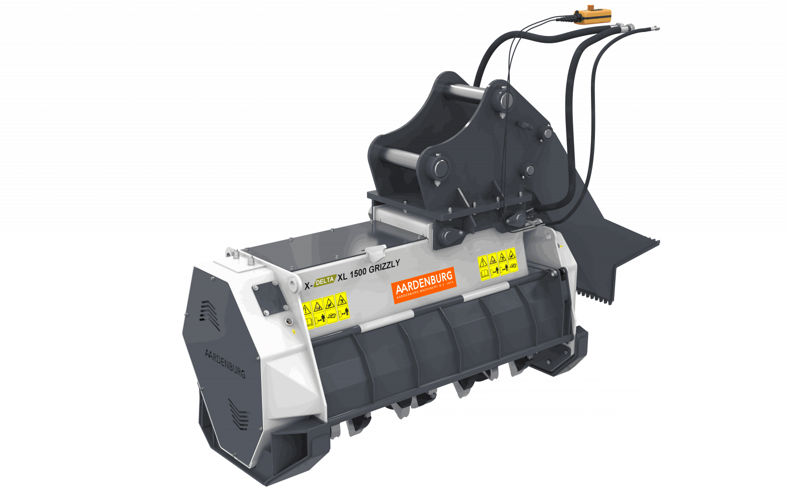 AARDENBURG X‑Delta XL 1500 Grizzly este un tocător forestier fix, profesional, destinat ștanțelor de excavatoare între 14–20 t. Construit din oțel rezistent și echipat cu cuțite vidia-fierbinte fixate, oferă o performanță de tăiere remarcabilă pentru vegetație densă și arbori de până la 20 cm diametru. Rotorul robust cu 7 curele asigură transmisie eficientă a puterii, iar ușa de acces controlată hidraulic din cabina excavatorului permite operare rapidă și sigură.