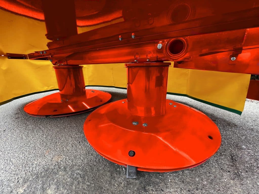 Această cositoare este echipată cu 2 discuri și 6 cuțite, rotindu-se la 2070 rpm, asigurând o tăiere curată și rapidă. Tamburul inferior rotativ previne afundarea discurilor în sol, chiar și în terenuri denivelate. Include apărătoare de protecție și sistem de blocare sigur pentru transport.