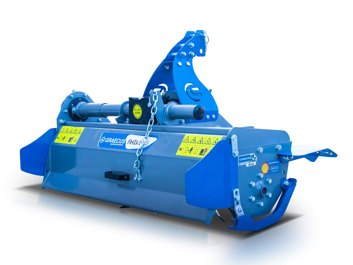 FREZA E115 este versiunea modernizată a modelului EF115, proiectată pentru tractoare cu putere redusă între 14 și 35 CP. Utilajul este ideal pentru afânarea solului în grădini, livezi sau terenuri agricole de dimensiuni mici și medii. Este echipat cu cuțite de 550g intarite special și un sistem de transmisie laterală prin lanț în baie de ulei cu întinzător automat. Dispunerea ușoară a prinderii în 3 puncte permite reglarea laterală mecanică pentru o adaptare rapidă pe teren. Capacul spate este reglabil pentru nivelare optimă a solului după frezare. Adâncimea de lucru se reglează cu ajutorul patinelor laterale.