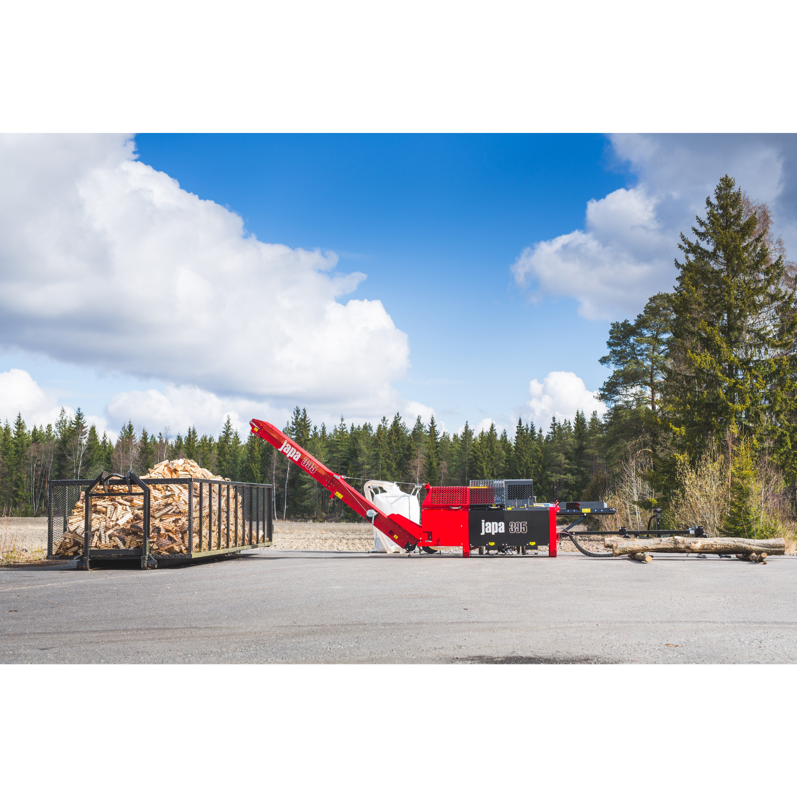 Japa® 395 TR – linie taiere-despicare lemne profesională, antrenat de tractor, cu putere de despicare de până la 12,5 tone, operare complet hidraulică și control ergonomic prin joystick. Proiectat pentru utilizatori care au deja tractor cu priză de putere, acest utilaj oferă eficiență și fiabilitate în producția de lemn de foc, fiind ideal pentru lucrări forestiere sau agricole.