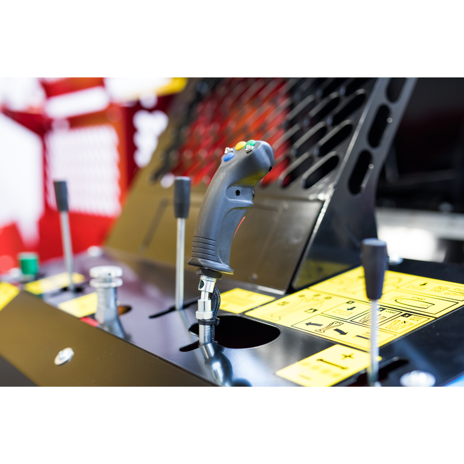 Control complet hidraulic: alimentare, tăiere, despicare și placa de evacuare, toate gestionate dintr-un singur joystick ergonomic.