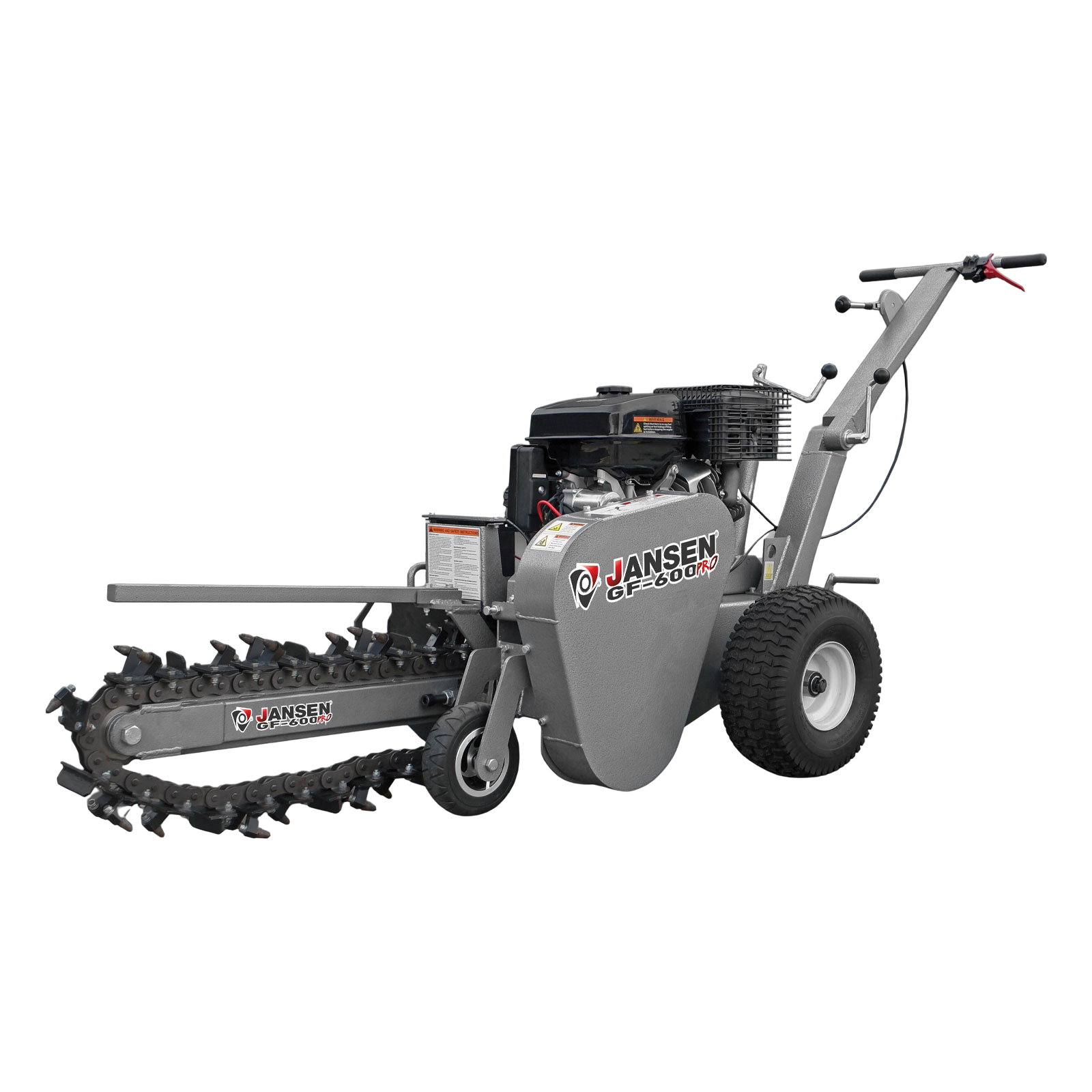 Utilajul de sapat santuri Jansen GF-600pro ghidat manual creează instantaneu șanțuri și canale de pământ cu o lățime de 10 cm și o adâncime maximă de tăiere de 60 cm.