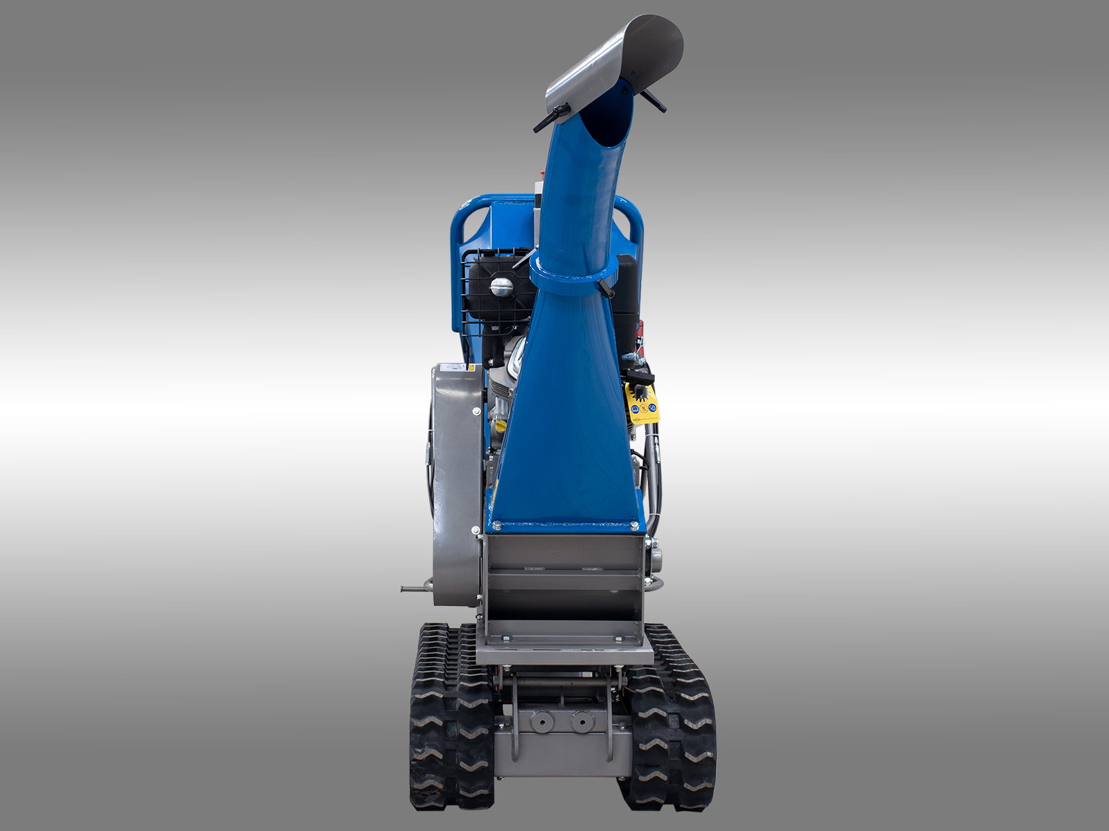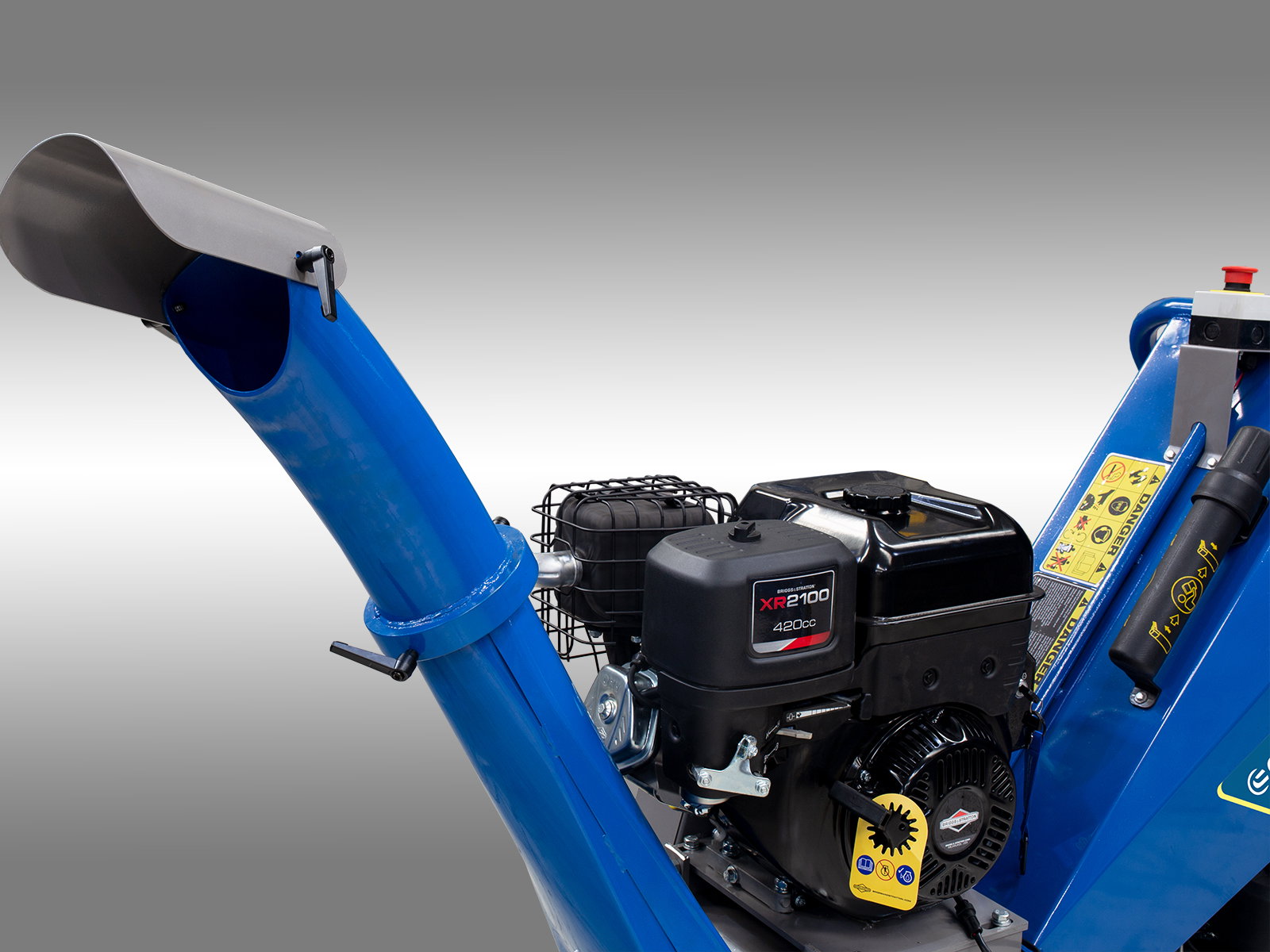 Distanta de evacuare este reglabilă prin clapeta de la partea superioară a conductei. Utilajul include o bena de transport de 300 kg, transformând tocatorul într-un vehicul utilitar multifuncțional.