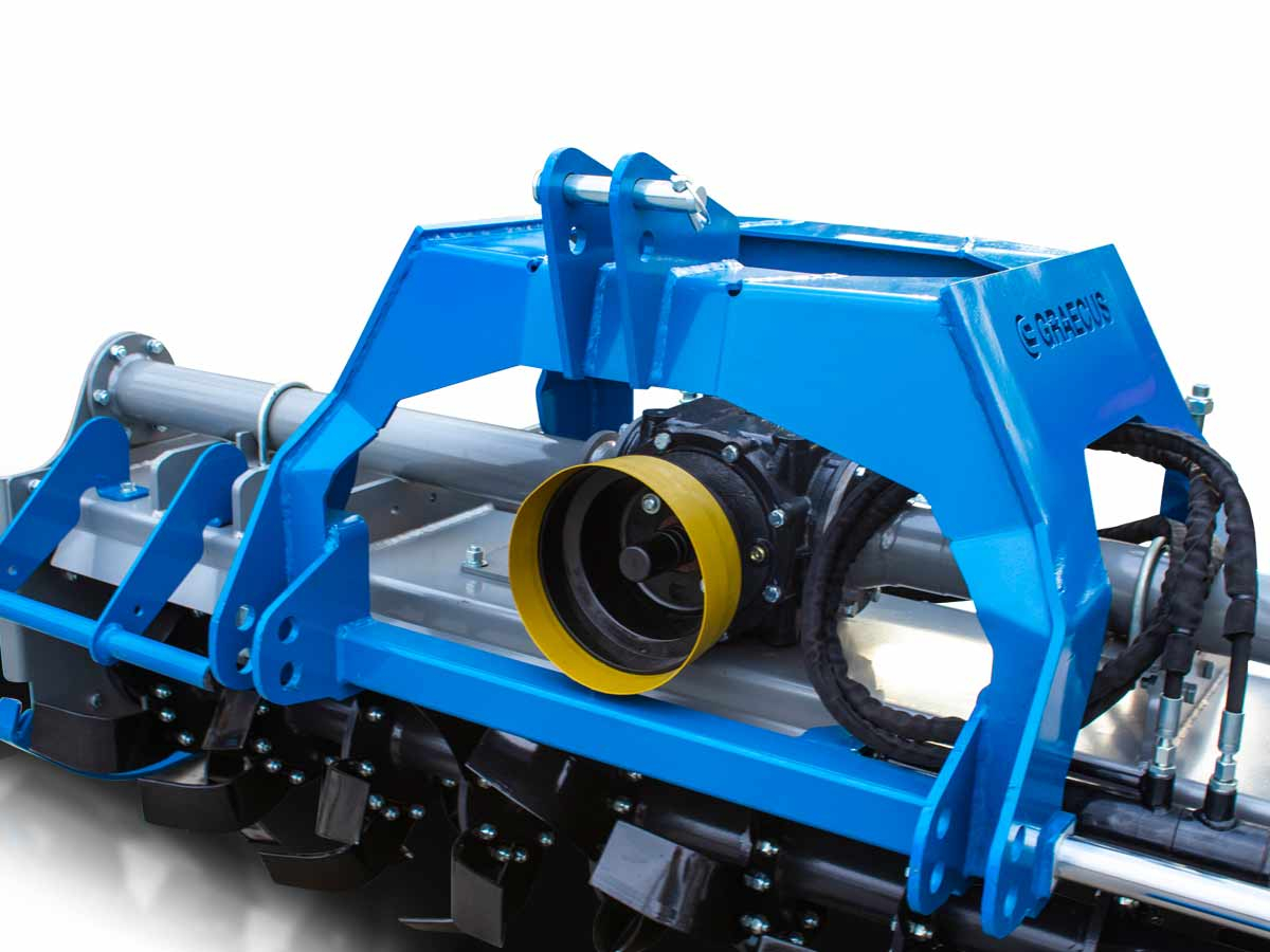 Freză profesională concepută pentru utilizare intensă în agricultură, potrivită pentru tractoare de 50–90 CP. Cu o lățime de lucru de 1600 mm, acest model oferă versatilitate și performanță în lucrări variate de pregătire a solului. Transmisia în 4 trepte permite adaptarea vitezei arborelui cu cuțite la condițiile de sol (187 / 207 / 229 / 254 rpm), asigurând rezultate optime indiferent de teren. Sistemul lateral cu roți dințate în baie de ulei, deplasarea hidraulică și construcția ranforsată cu apărători din fontă oferă fiabilitate pe termen lung și protecție în exploatare.