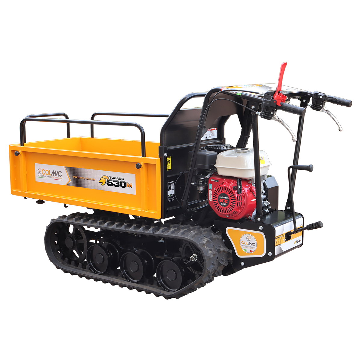 Transportorul pe șenile Colmac Tucano 530M, echipat cu motor Honda GX200 de 6 CP, este ideal pentru transportul materialelor în agricultură, construcții, silvicultură, grădinărit și multe alte aplicații. Cu o capacitate de încărcare de 350 kg pe teren plat, șenilele cu 3 role oferă o tracțiune excelentă chiar și pe teren accidentat sau înclinat.